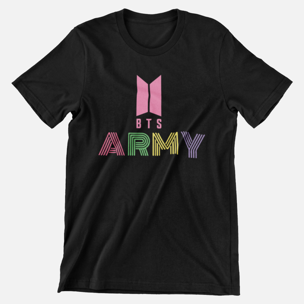 تيشيرت عصري بتصميم شعار BTS وكلمة ARMY بألوان مبهجة، مصنوع من قطن عالي الجودة ومناسب للجنسين (رجالي ونسائي).